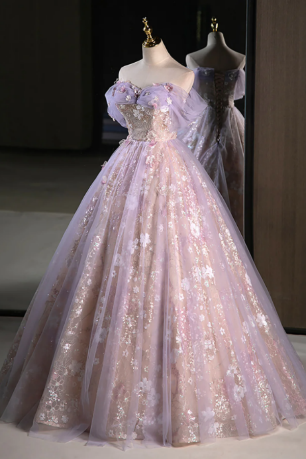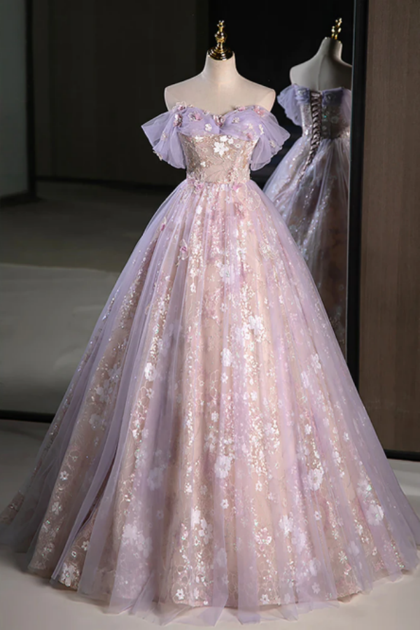 A Line Off Shoulder Tulle Lace Purple Long Prom Dress, Purple Formal Dress KPP1540