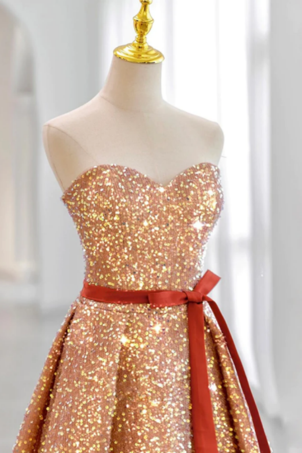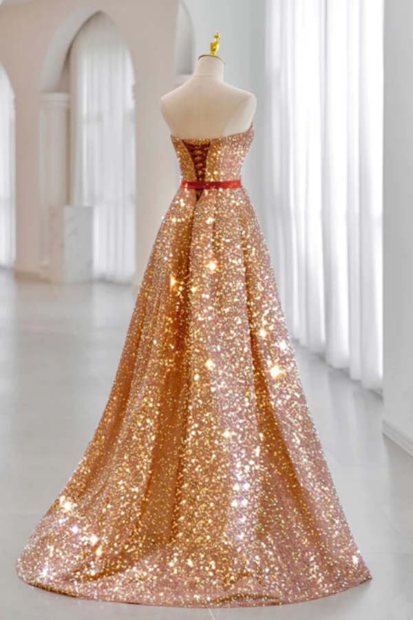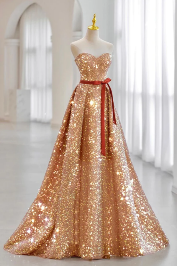 A Line Sweetheart Neck Velvet Sequin Champagne Gold Long Prom Dress KPP1580