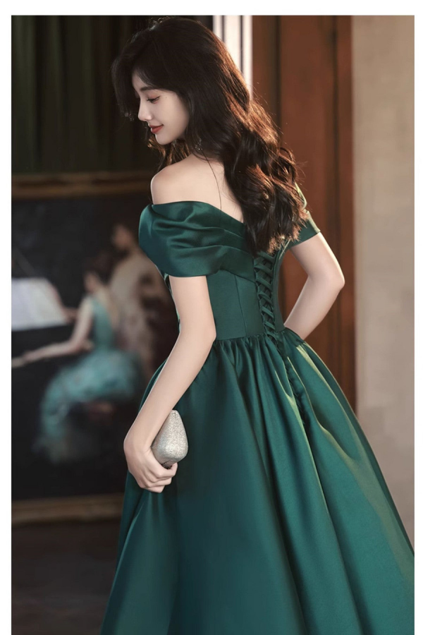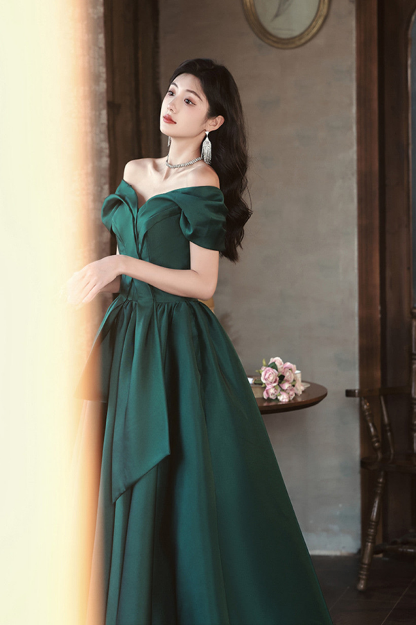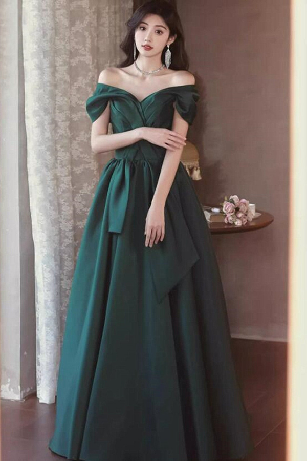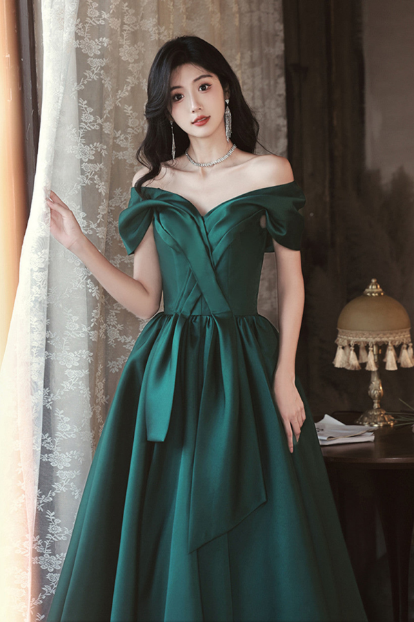 Green Satin Off Shoulder Long Party Dress, Green A Line Chic Prom Dress KPP1664