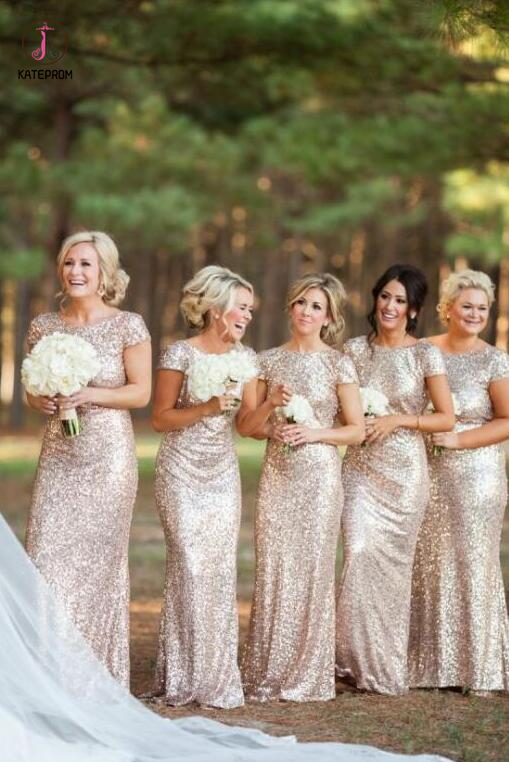 Kateprom Mermaid Cap Sleeve Gold Sparkly Long Bridesmaid Dresses KPB0017
