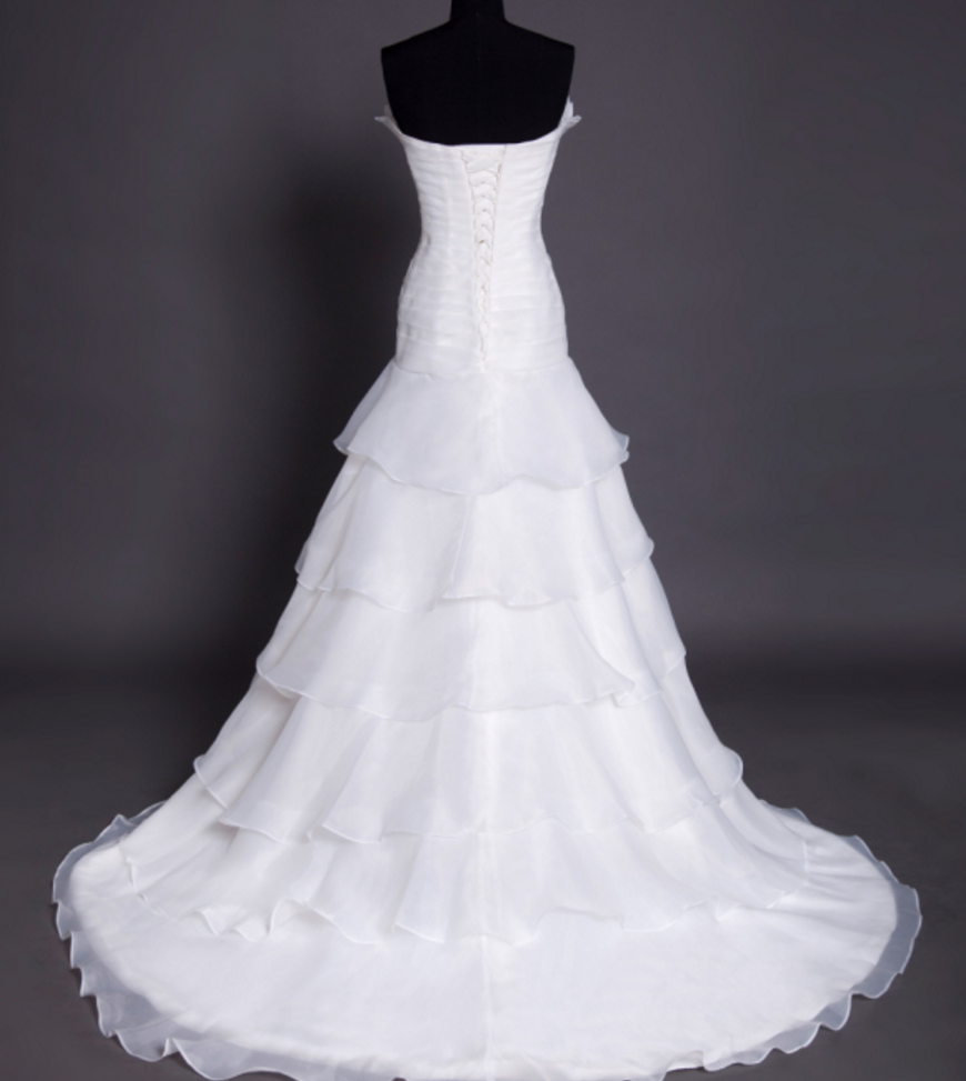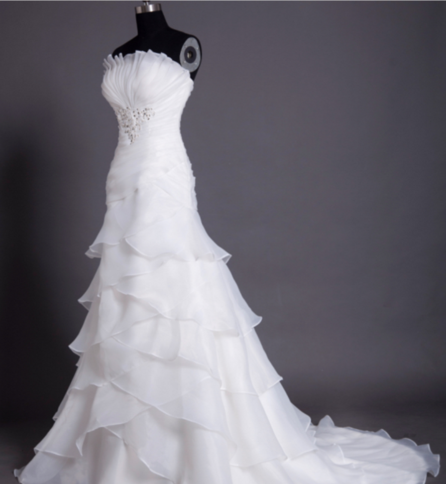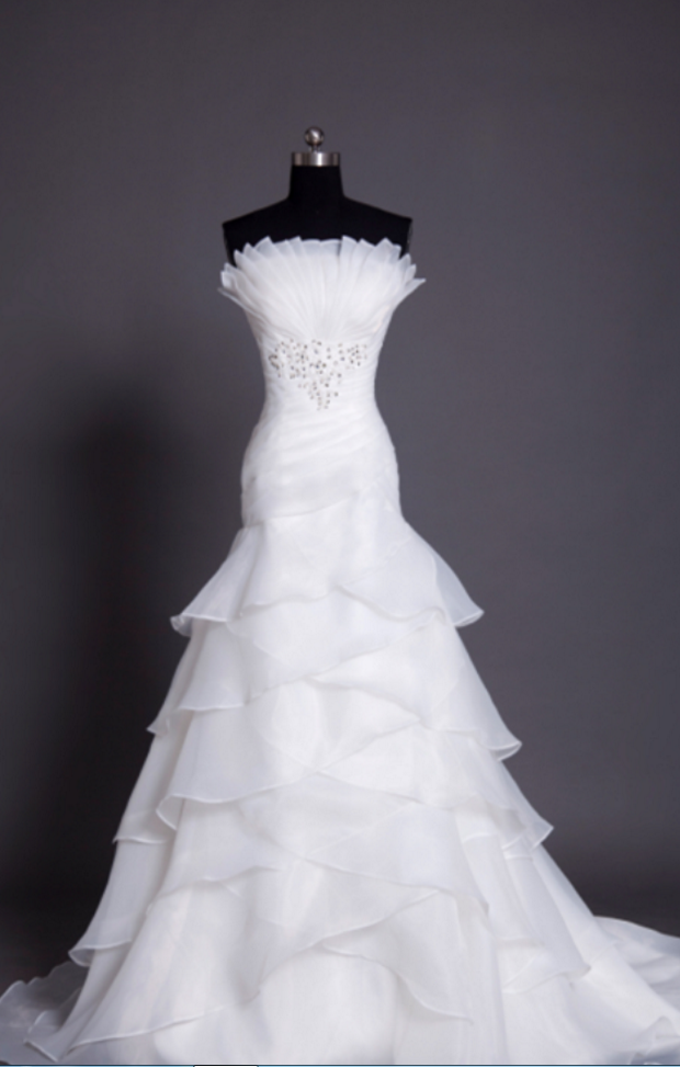 Strapless Ruched Beaded White Organza Mermaid Wedding Dress with Tiered Ruffle Skirt KPP0304