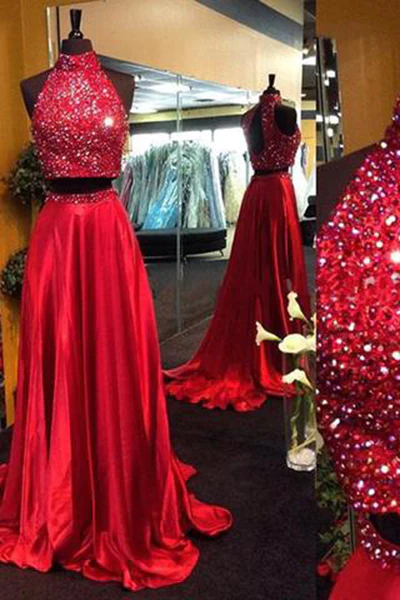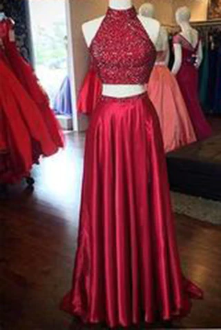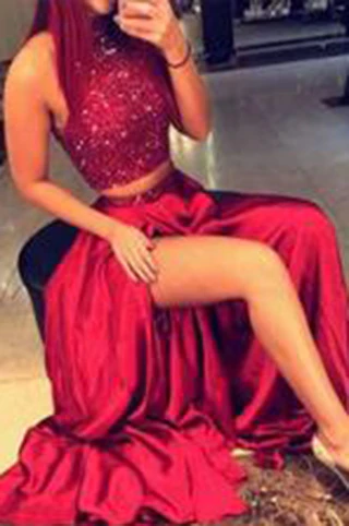 Burgundy Two Piece Beading Halter Open Back Carpet Slit Long Prom Dresses KPP0657