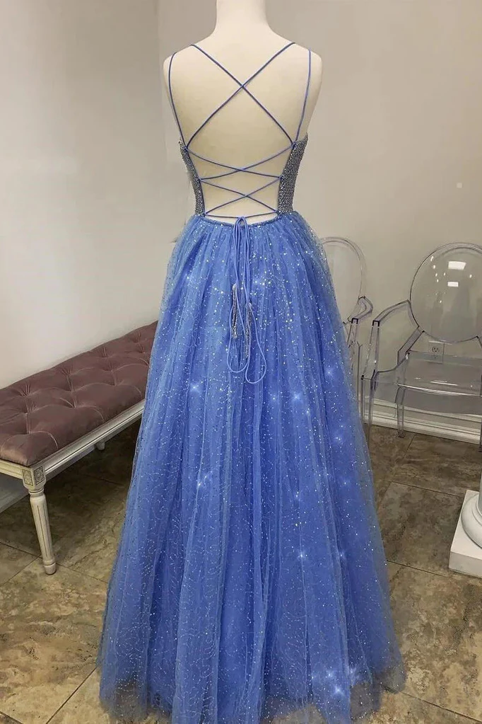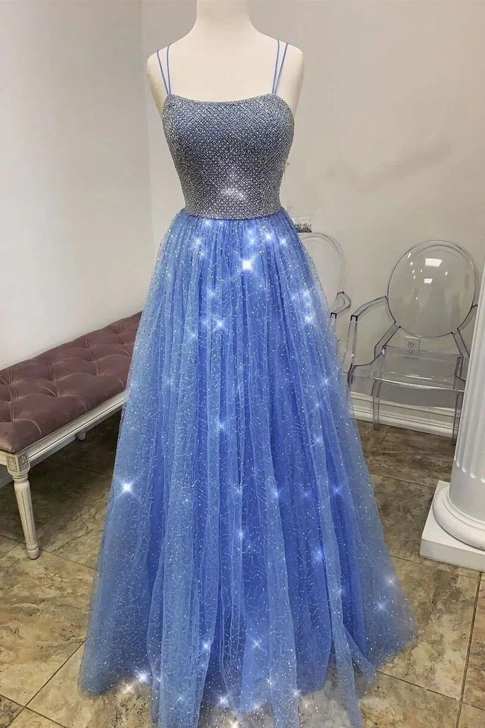Sparkly A Line Spaghetti Straps Tulle Prom Dress Beaded Long Evening Dress KPP0713