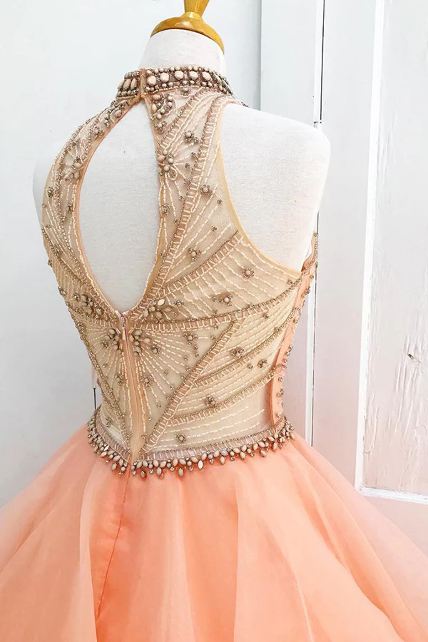 Chic A Line Halter Open Back Sleeveless Pearl Pink Beading Tulle Long Prom Dress KPP0753