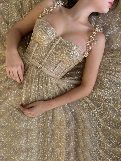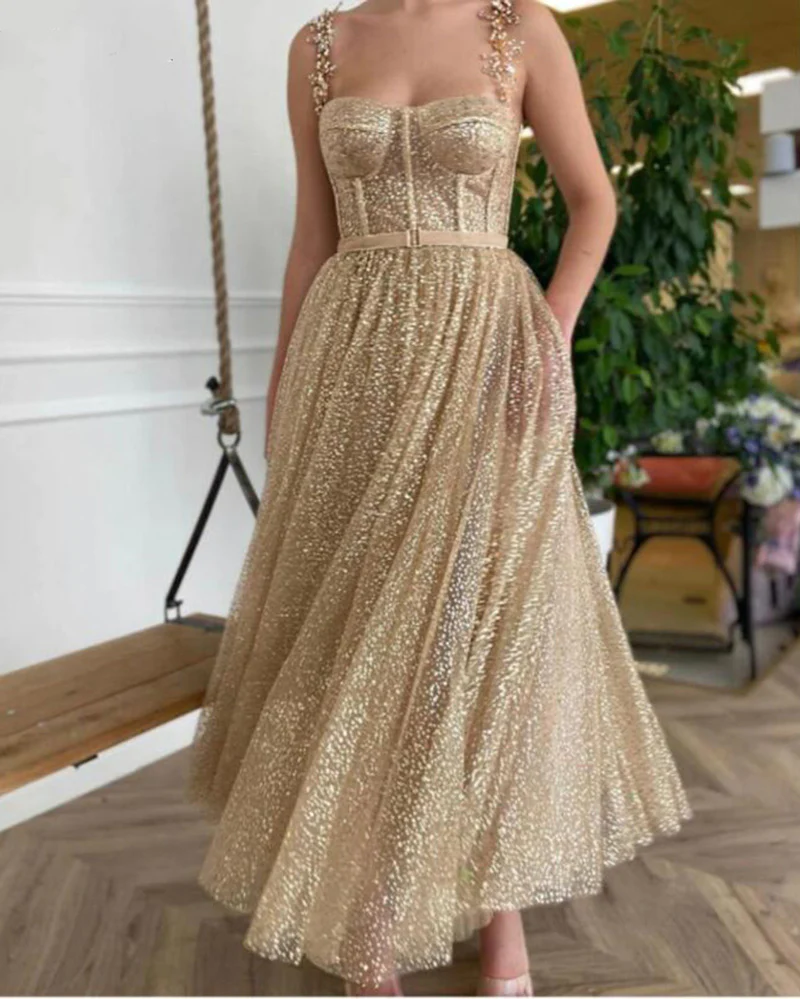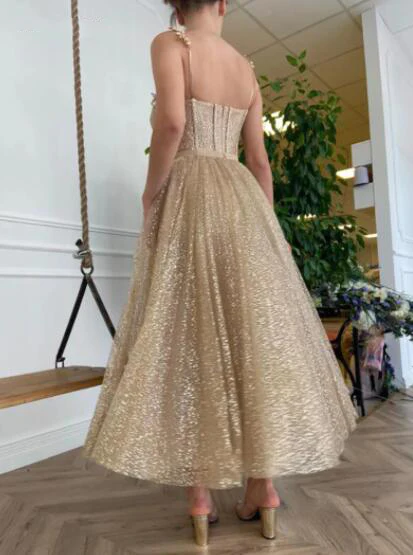 Gold Glitter Tea Length Prom Dresses Straps A Line Short Evening Dress Party dresses KPP0813
