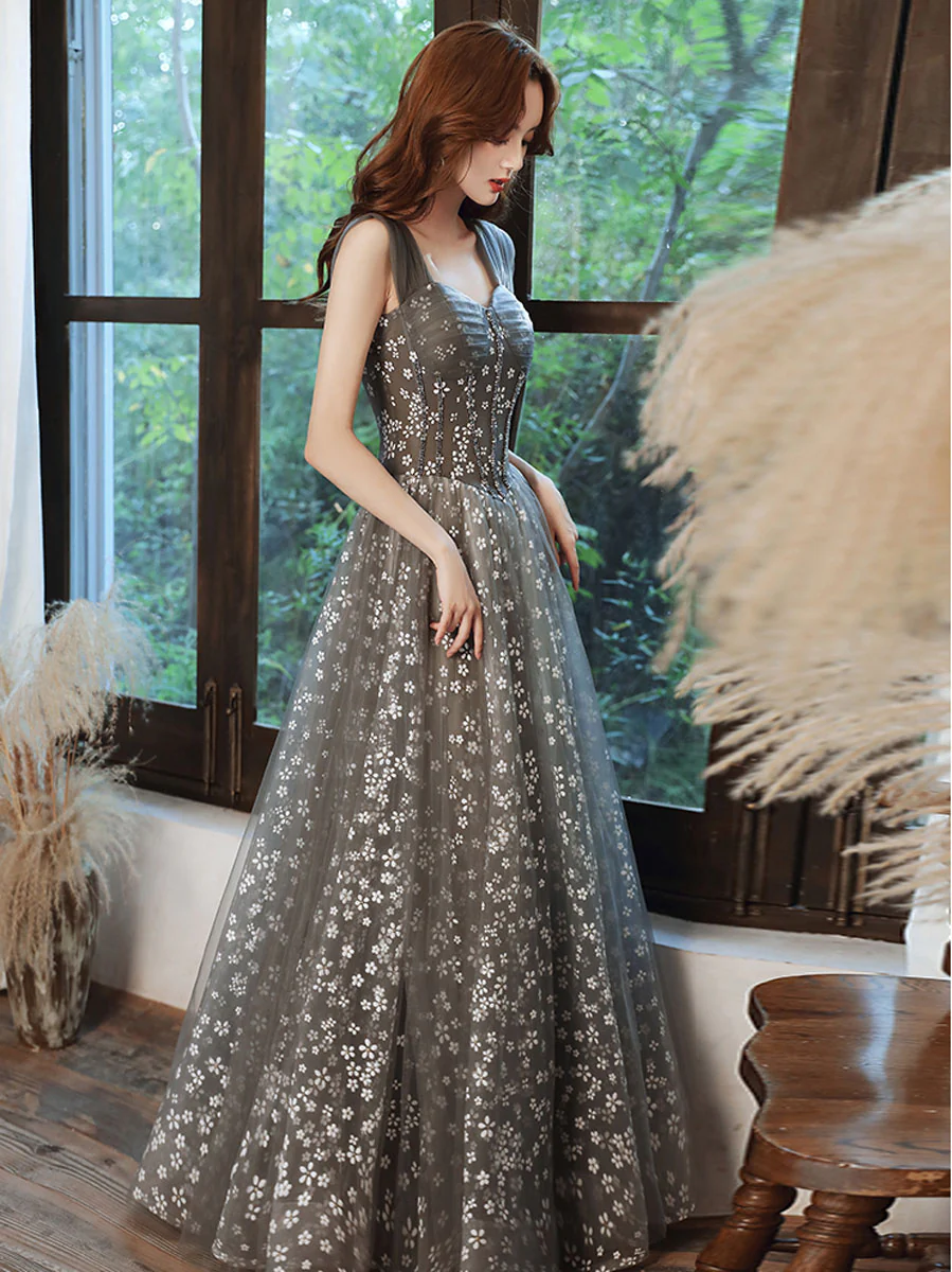 Gray A line tulle beads long prom dress gray tulle formal party dress KPP1025