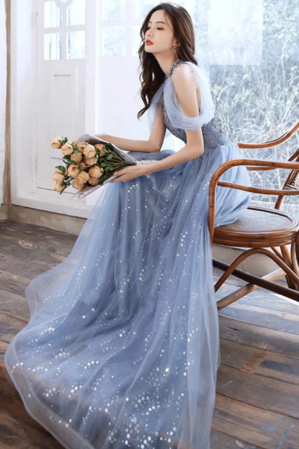 A Line Off Shoulder Tulle Blue Long Prom Dress, Blue Lace Long Formal Dress KPP1545