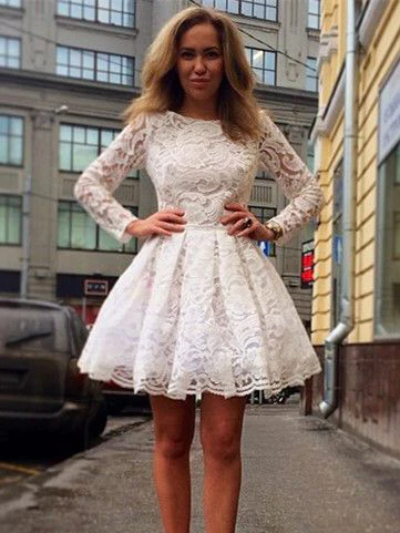 White Homecoming Dress Long Sleeve Lace Short Prom Dress Party Dress KPP0532