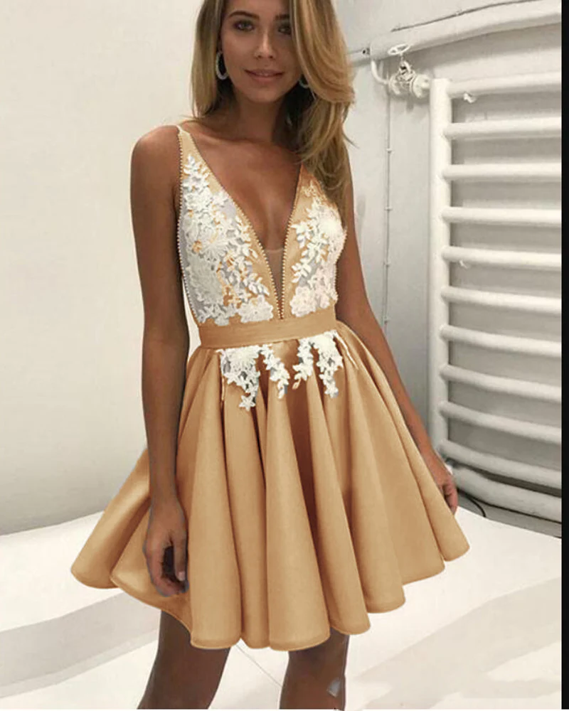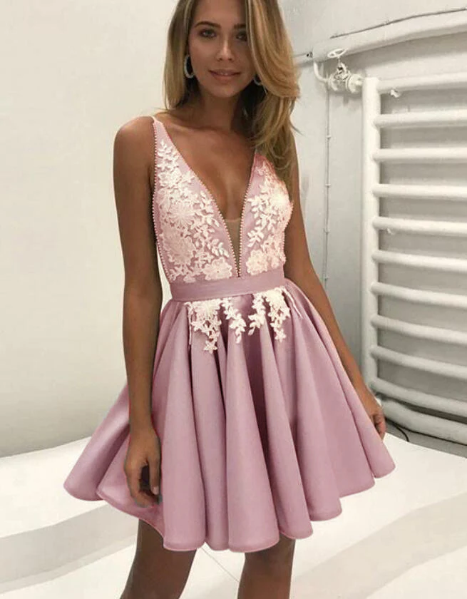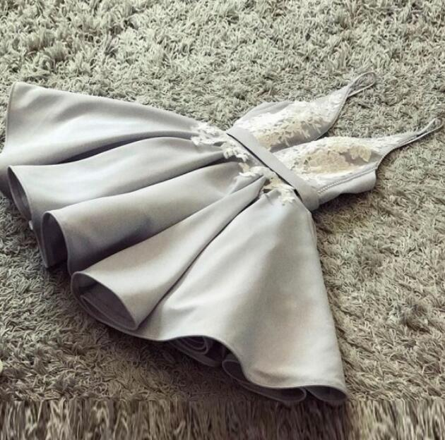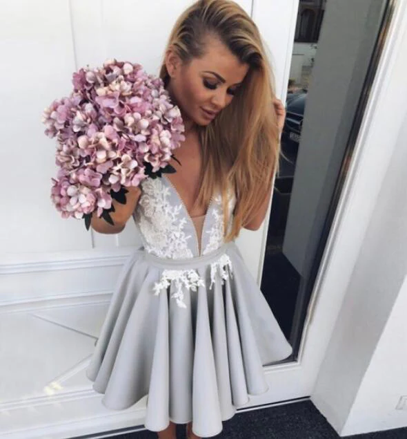Cute V Neck Lace Gray Short Prom Gown Junior Graduation Homecoming Party Dresses for Girls KPP0859