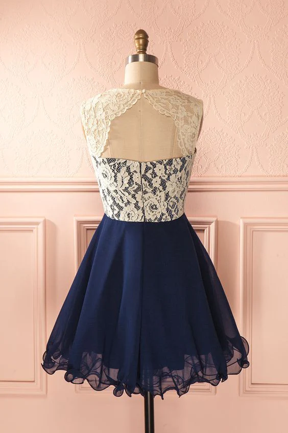 Cute lace chiffon dark blue short prom dress, homecoming dress KPP1142