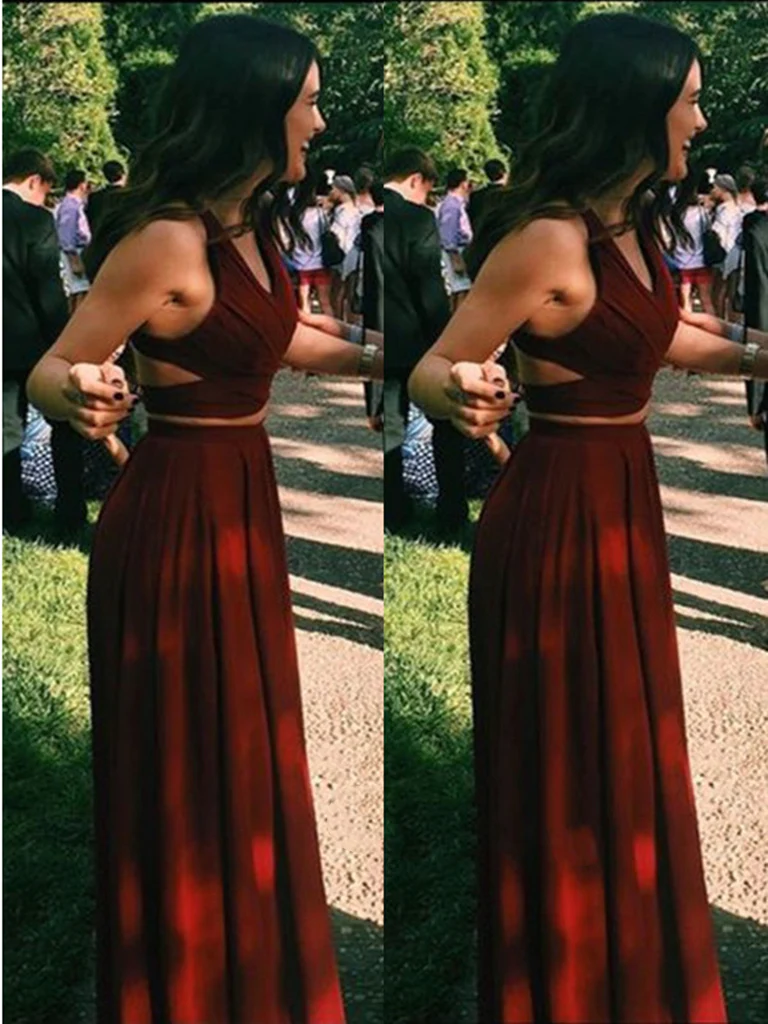 A Line Two Pieces Maroon Long Prom Dresses, Two Pieces Maroon Bridesmaid Dresses KPP1171