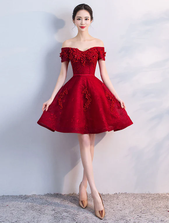 Off Shoulder Wine Red Short Beaded Homecoming Dress, Short Prom Dress, Graduation Party Dress KPP1235