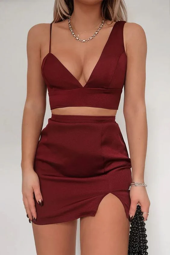 Burgundy Two Pieces Homecoming Dresses,Sexy Dark Red Satin Mini Cocktail Dress KPP1463