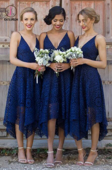 Kateprom Spaghetti Straps Dark Navy Short Bridesmaid Dresses ,Lace Prom Dress KPB0009
