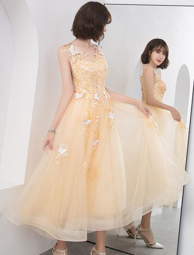 Lovely Champapgne Tulle Tea Length Party Dress with Butterfly, Cute Short Homecoming Dress KPP1271