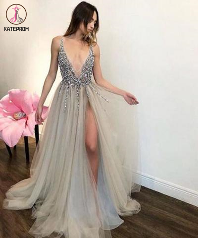 Kateprom Sexy Gray Beading Prom Dress ,Tulle V Neck Long Prom Dress,Cheap Evening Dress KPP0225
