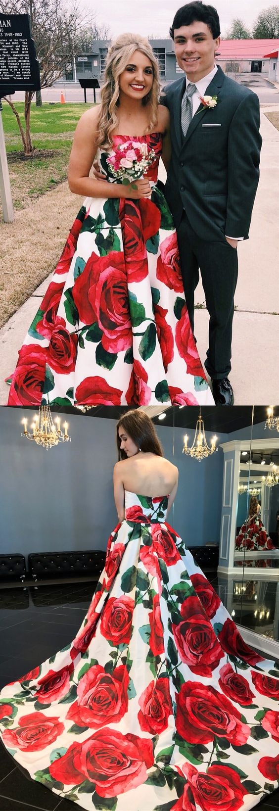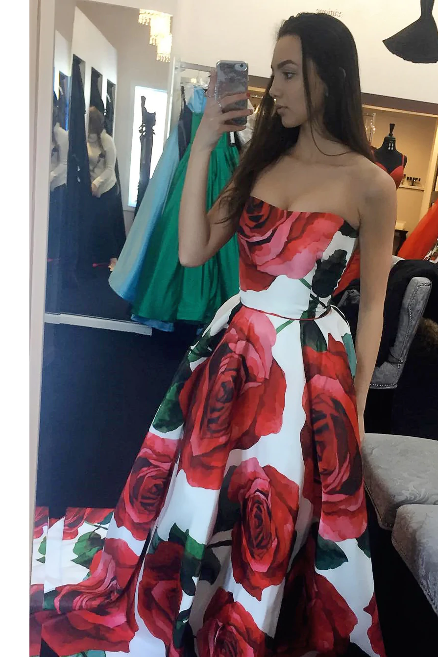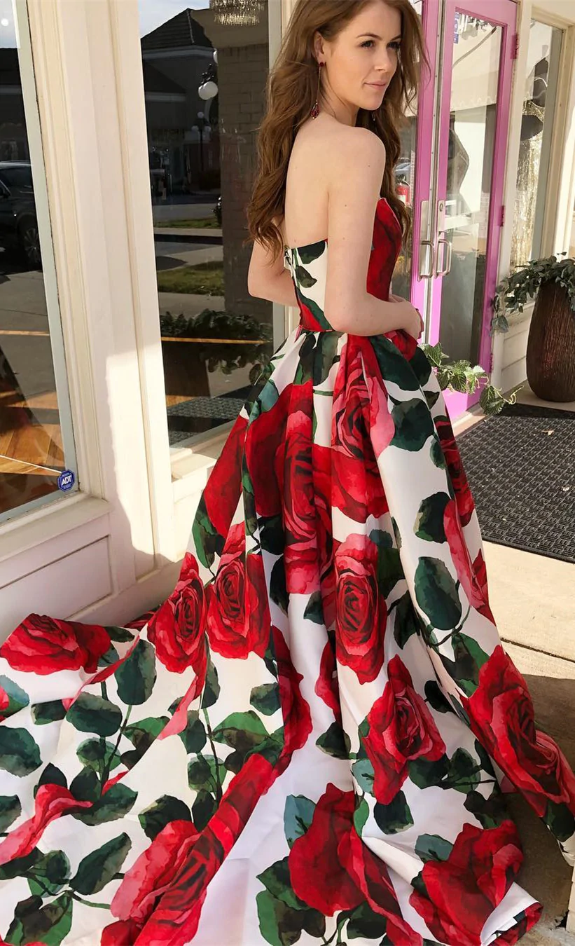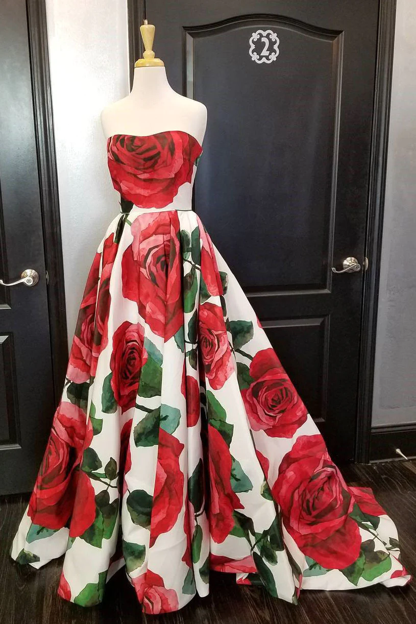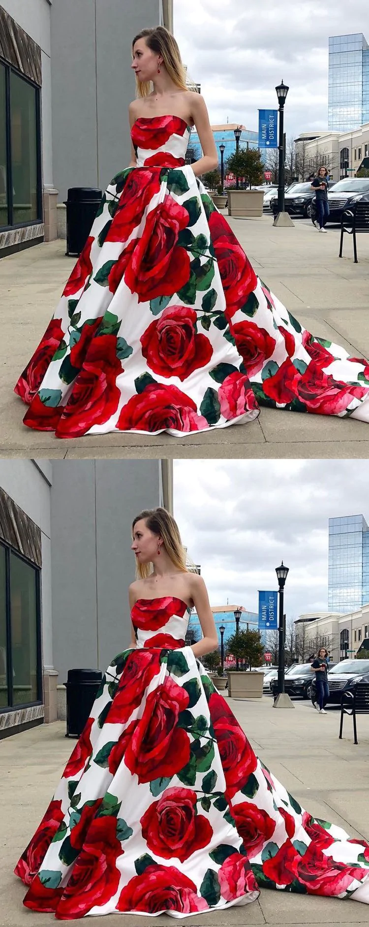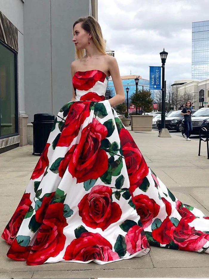 Chic Prom Dresses A Line Rose Floral Print Sweep Train Long Prom Dress KPP0460