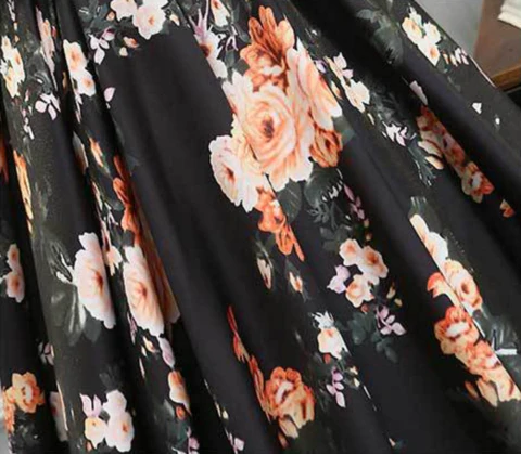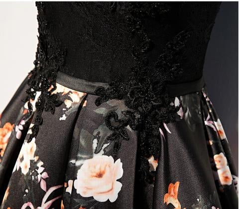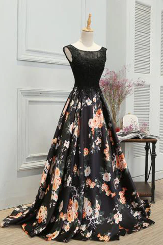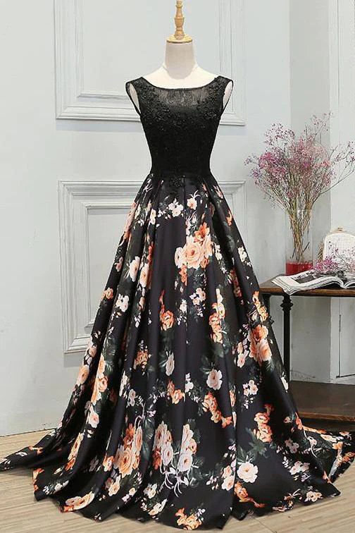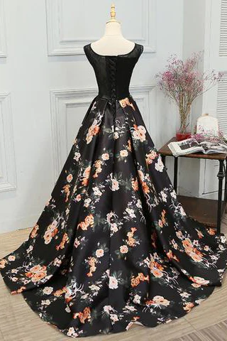 Chic A-Line Scoop Satin Black Lace up Sleeveless Long Flowers Prom Dresses KPP0652