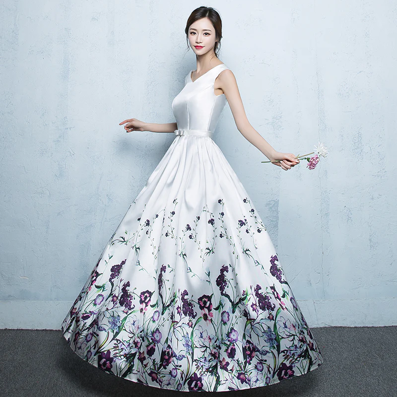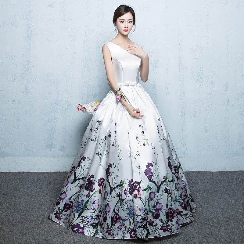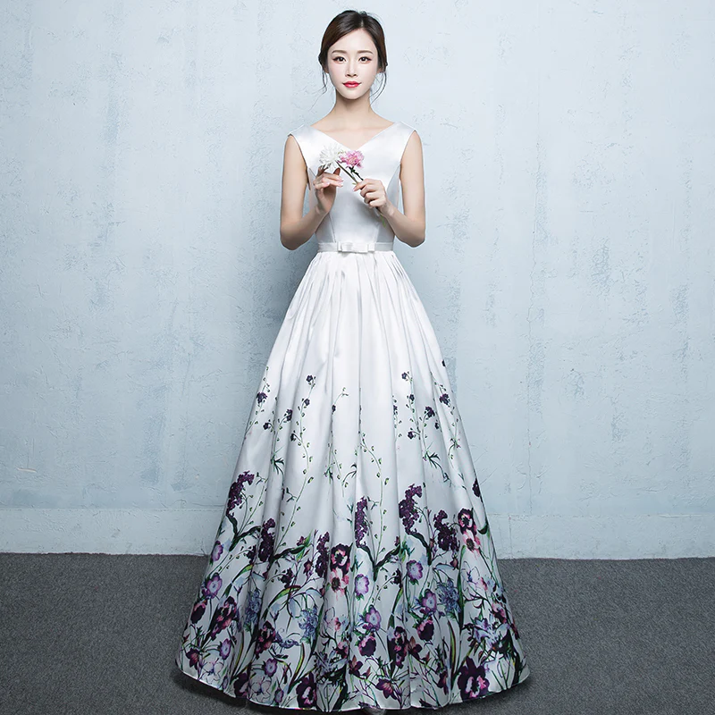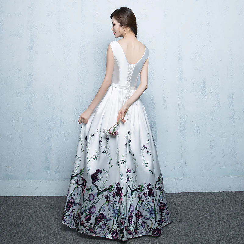 White A Line Floral Prom Dresses Satin Formal Evening Gowns KPP0892