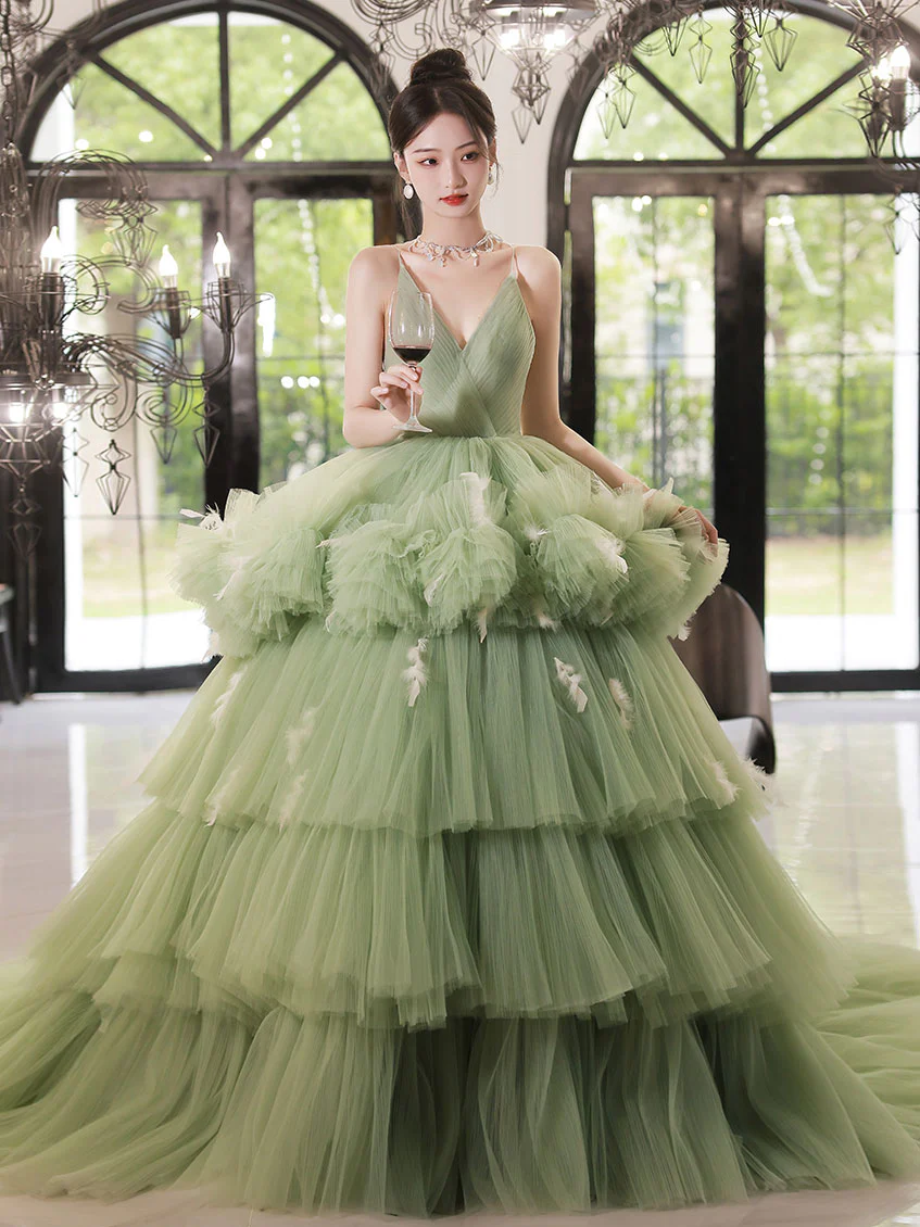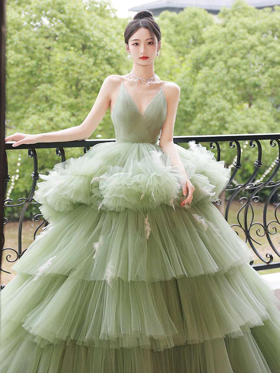 Green v neck tulle long prom dress, green tulle sweet 16 dress KPP1035