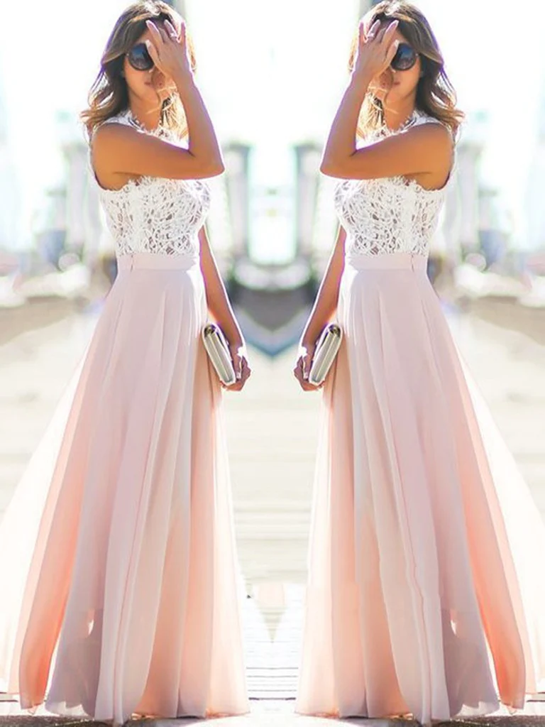 A Line Sleeveless Floor Length Lace Pink Prom Dress, Pink Formal Dress KPP1190