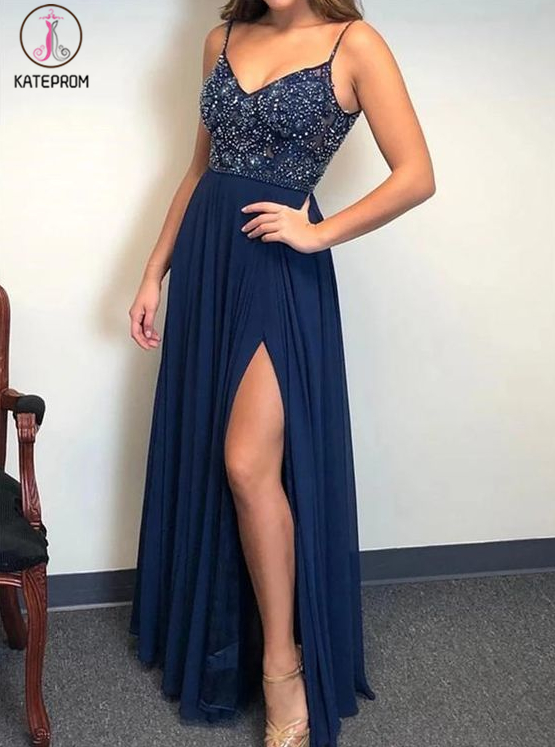 Kateprom Sexy Spaghetti Straps Long Beaded Prom Dress with Split Slit KPP00013