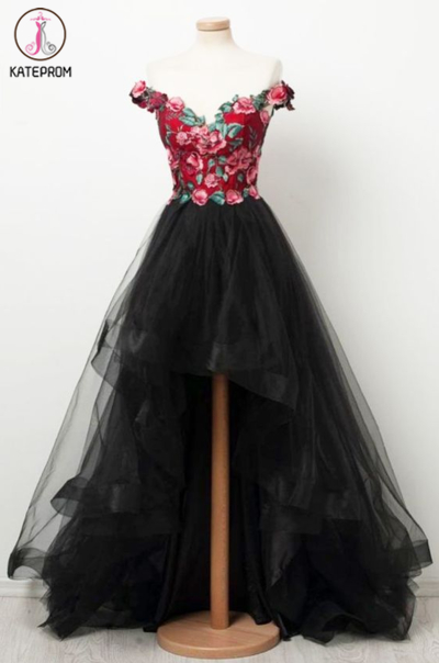 Kateprom Off Shoulder Red Embroider Black Tulle High Low Homecoming Dress, Prom Dress KPP0057