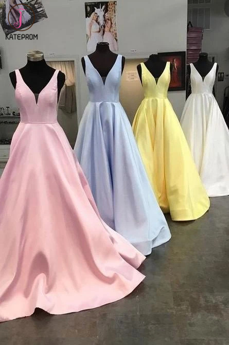 Kateprom Simple V Neck Straps Long Unique Yellow Satin Prom Dresses KPP0065