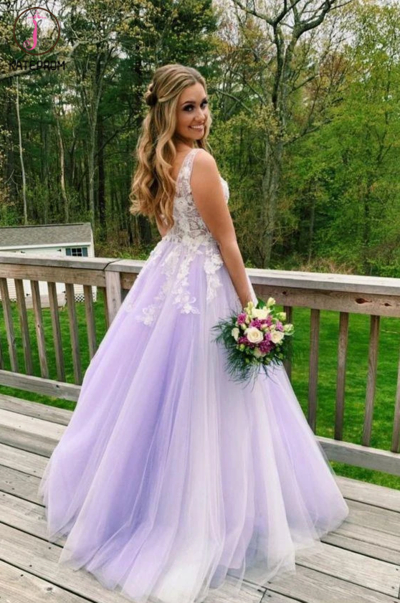 Kateprom Beautiful A Line Lilac Appliques Tulle Long Prom Dresses, V Neck Formal Gowns KPP0069