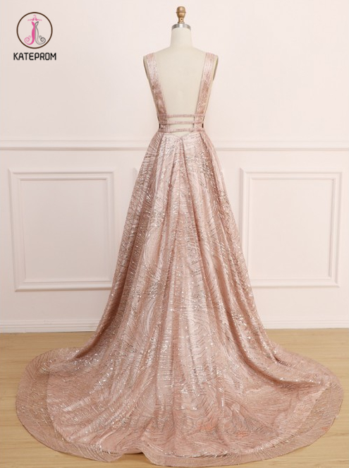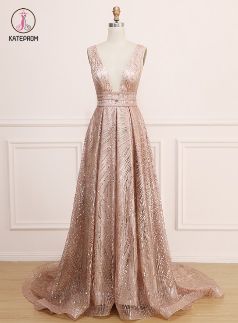 Kateprom Sexy V-Neck A-Line Backless Champagne Prom Dress with Sequins KPP0071