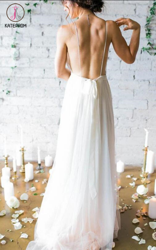 Kateprom Simple A Line Deep V-neck Sweep Train Ivory Wedding Dresses ,Bridal Gown KPW0043