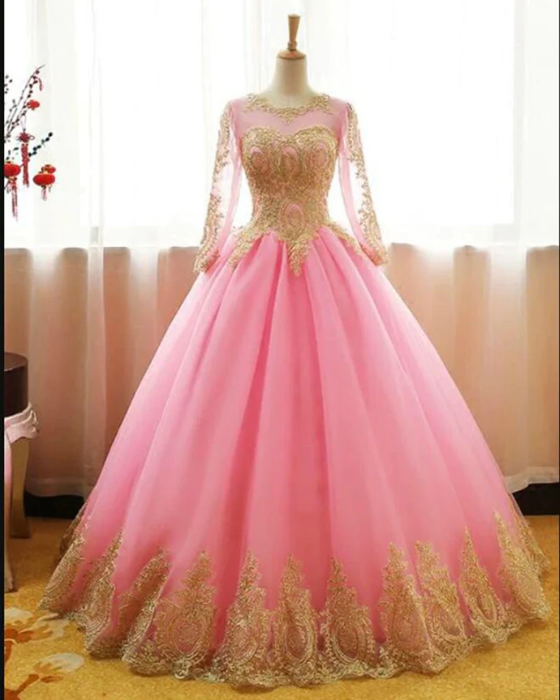 Vintage Gold Lace Long Sleeves Pink /Navy Quinceanera Dress Ball Gown Formal EveningParty Dress KPP0845