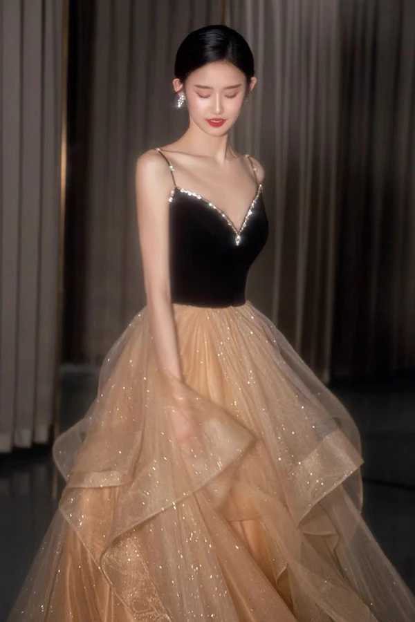 Shiny Spaghetti Straps V Neck Prom Dress, A Line Evening Dress With Layers KPP1573