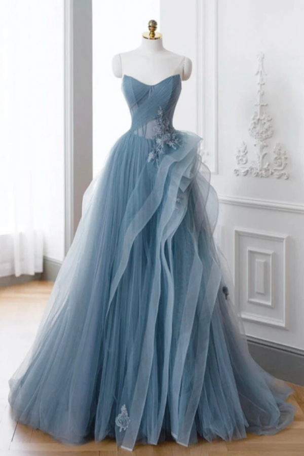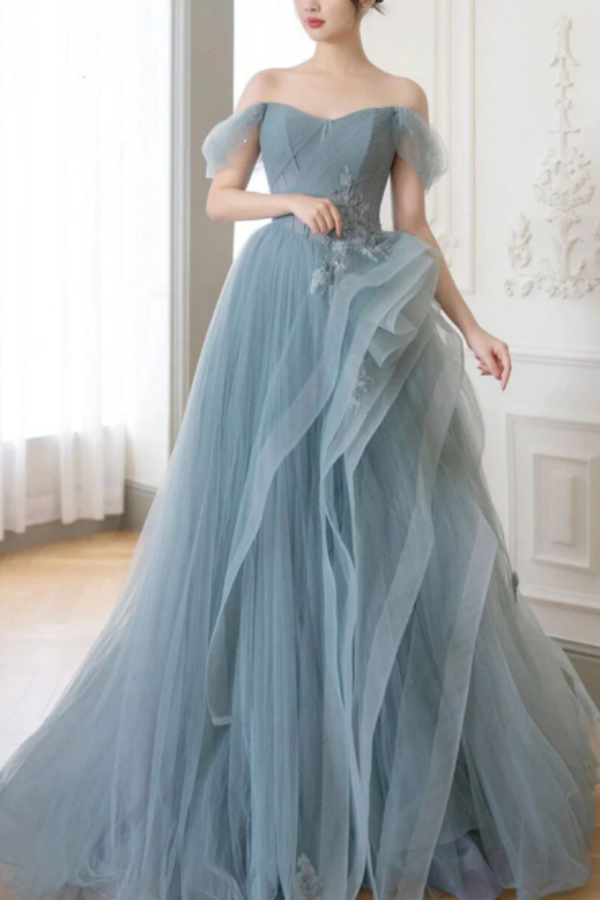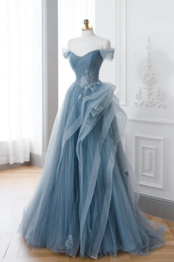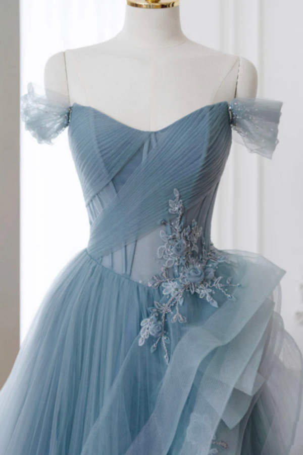 A Line off Shoulder Tulle Lace Gray Blue Long Prom Dress, Blue Long Formal Dress KPP1593