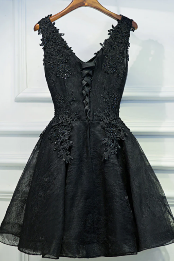 A Line V Neck Short Black Lace Prom Dresses, Black Short Formal Dresses KPP1597