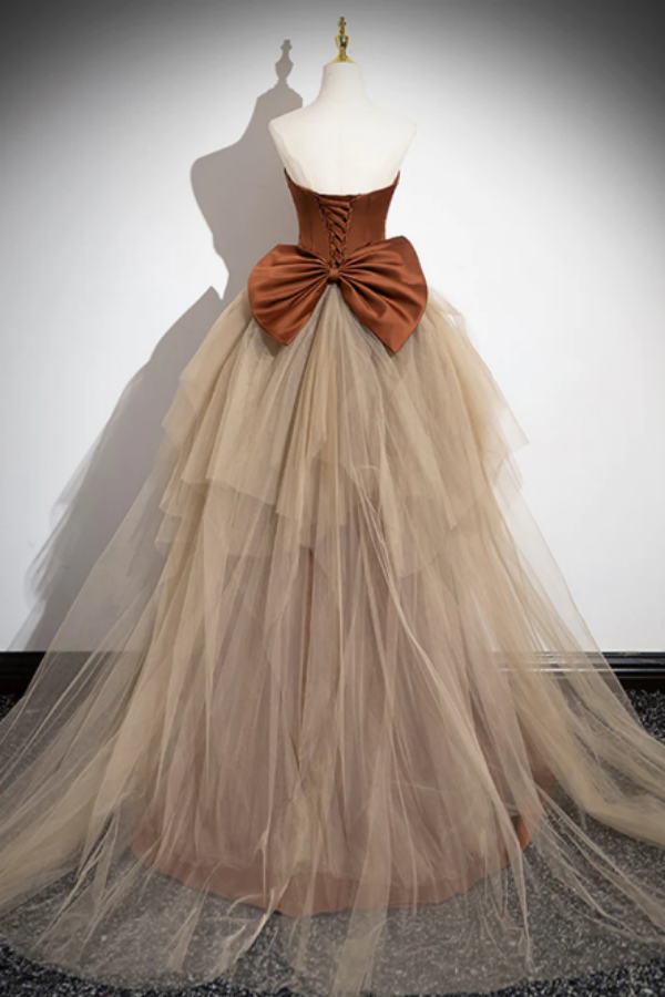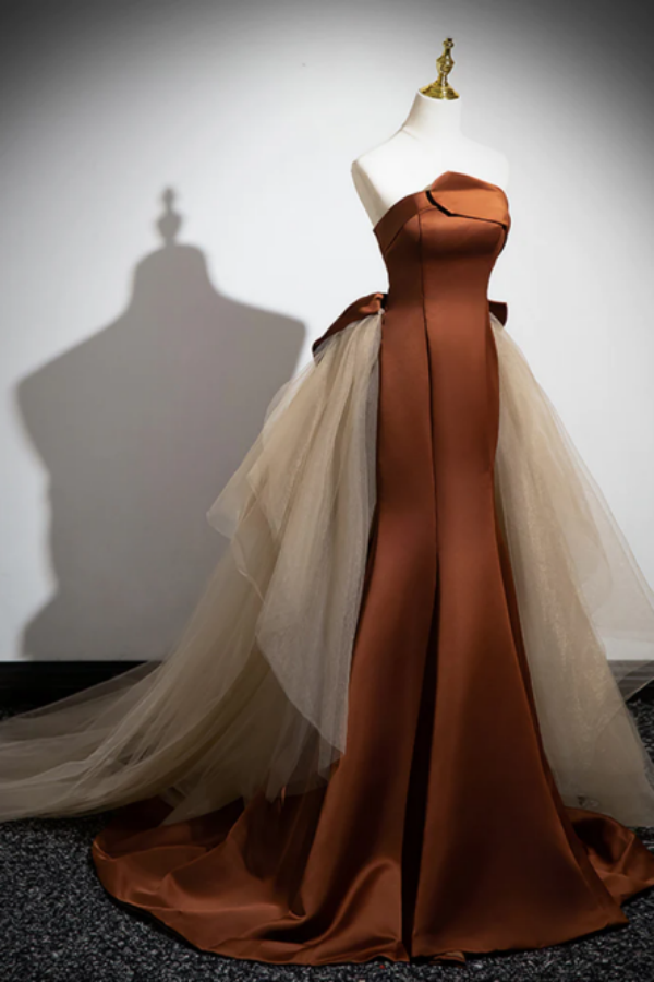 Simple Mermaid Brown Champagne Satin Tulle Long Prom Dress, Brown Long Evening Dress KPP1611