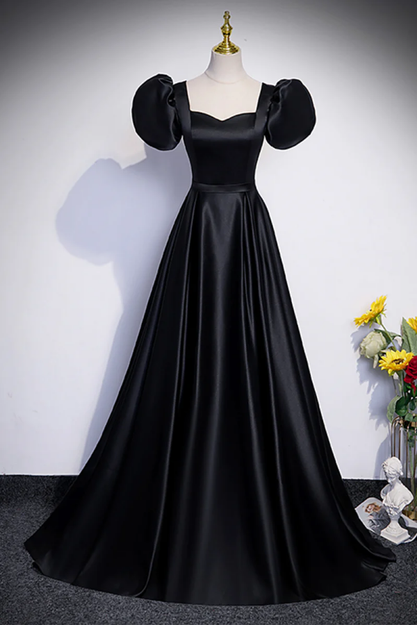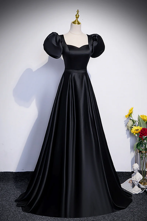Black Satin Floor Length Prom Dress, Simple Black Short Sleeve Evening Dress KPP1615