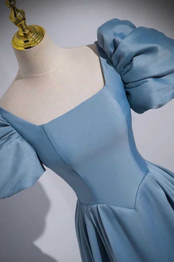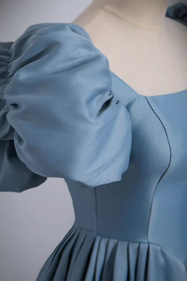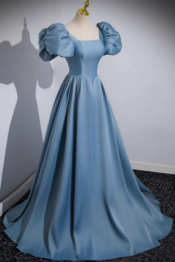 A Line Puff Sleeves Satin Blue Long Prom Dress, Blue Long Formal Dress KPP1616