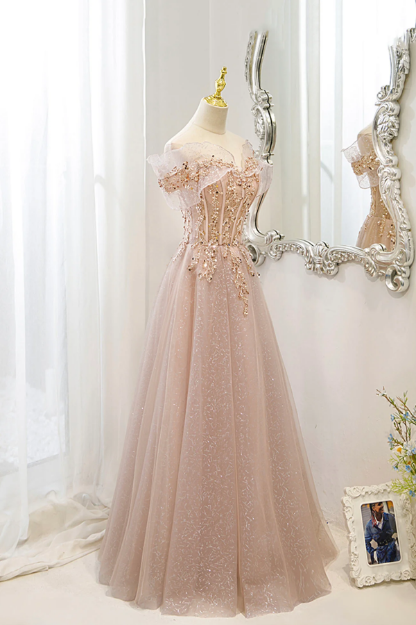 Pink Tulle Sequins Long Prom Dresses, A Line Off the Shoulder Evening Dresses KPP1621