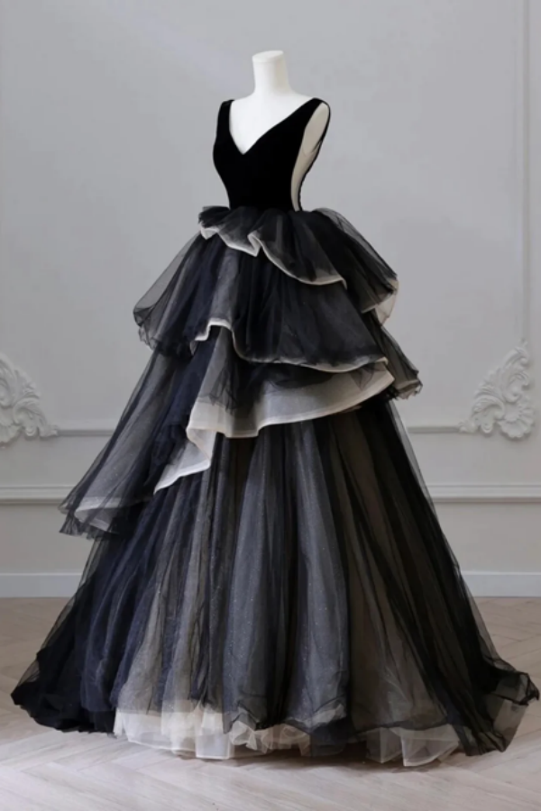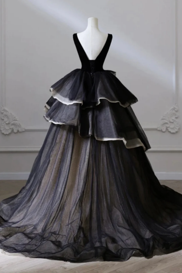 Black V Neck Puffy High Low Long Prom Dresses, Black V Neck High Low Formal Evening Dresses KPP1643
