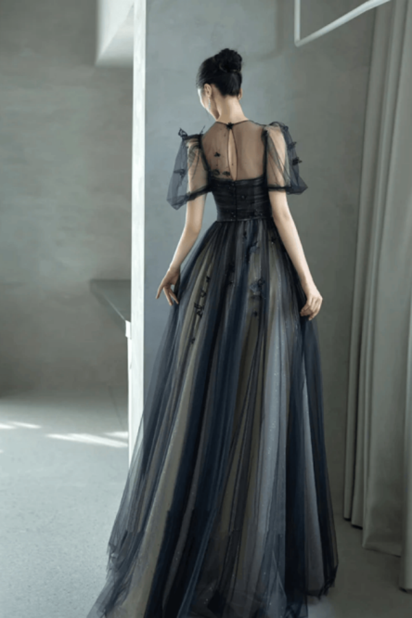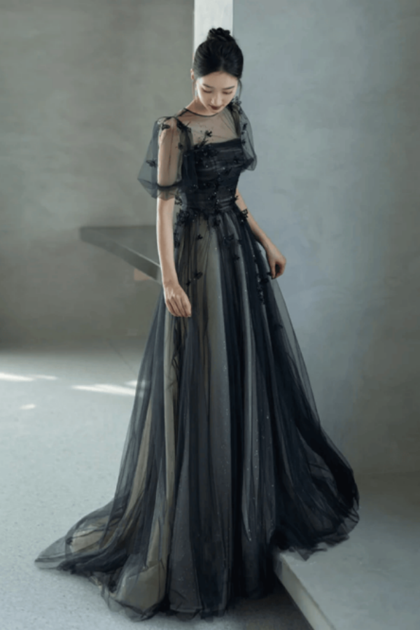 Black A Line Tulle with Lace Long Party Dress, Black Tulle Prom Dress KPP1655