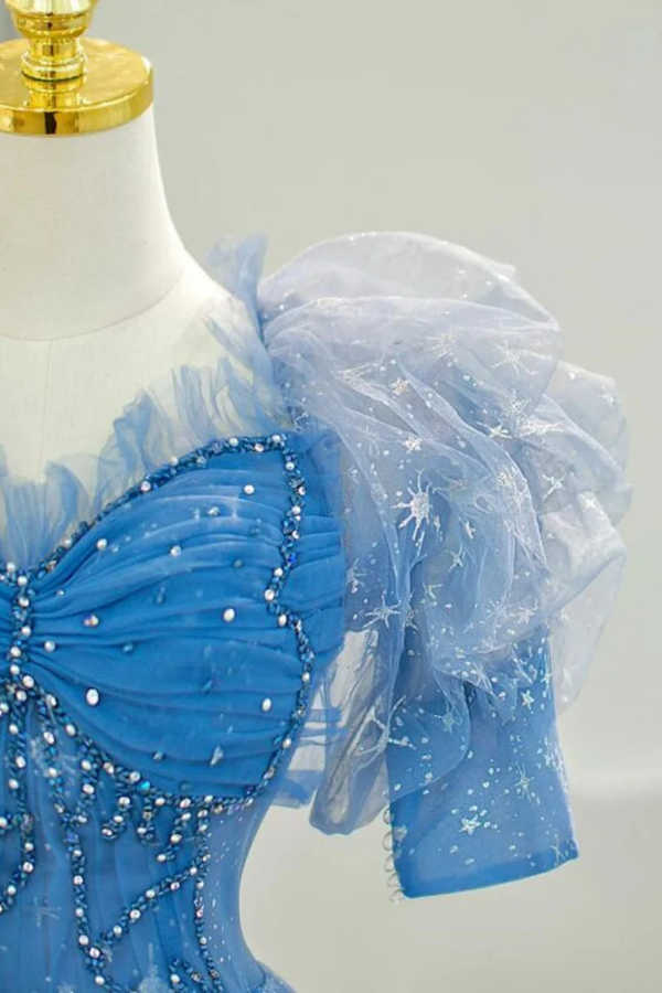 A Line Blue Beaded Short Sleeves Prom Dress, Blue Stars Long Evening Dress KPP1666