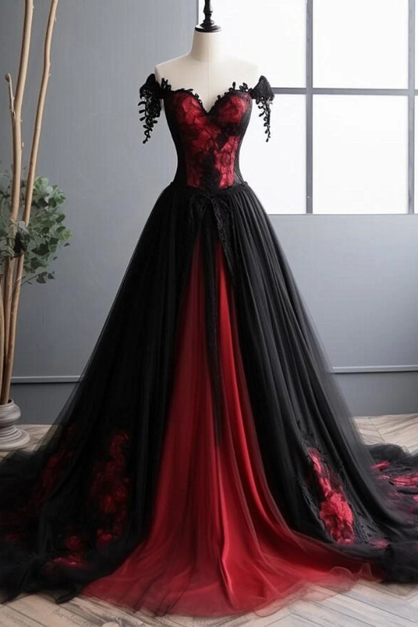Black and Red Tulle Long Prom Dress, Black and Red Formal Gown KPP1691