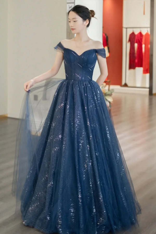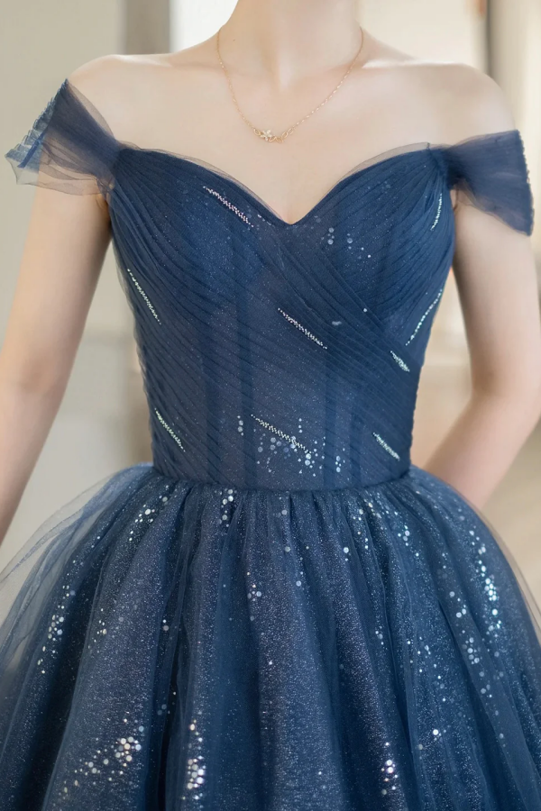 Blue Shiny Tulle Floor Length Prom Dress, Off the Shoulder A Line Evening Party Dress KPP1727
