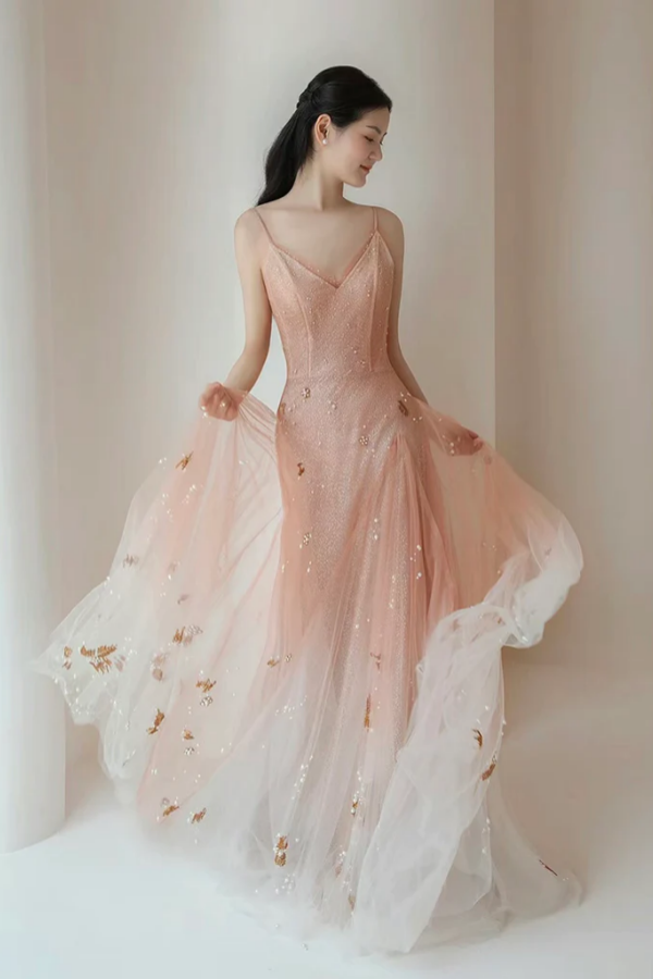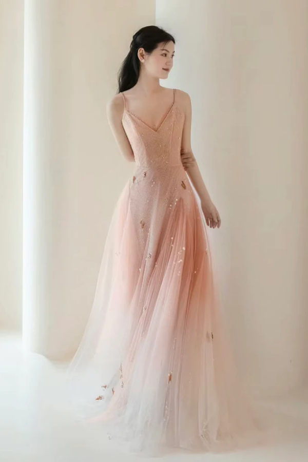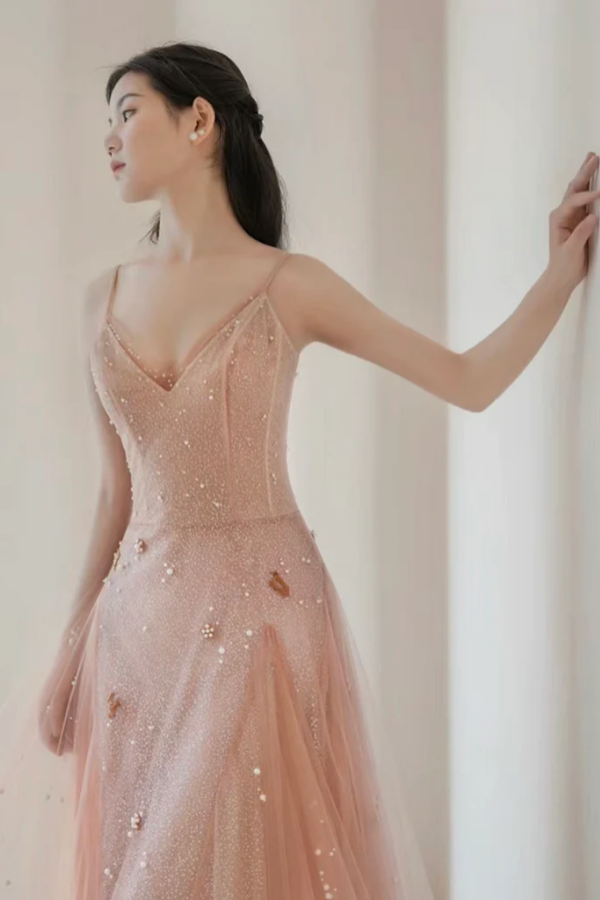 A Line V Neck Tulle Pink Long Prom Dress, Pink Tulle Long Evening Dress KPP1729