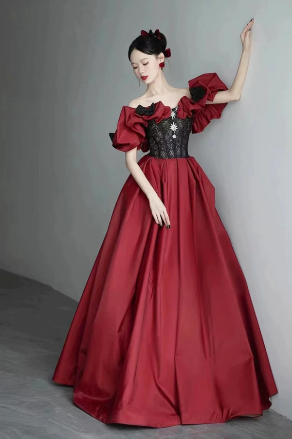 Burgundy Satin and Black Lace Floor Length Prom Dress, Off the Shoulder Evening Party Dress KPP1738