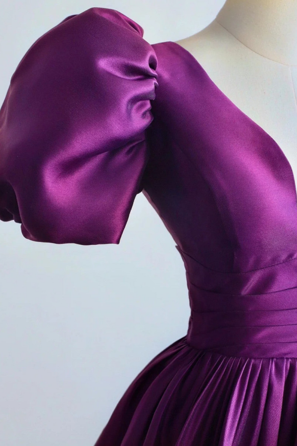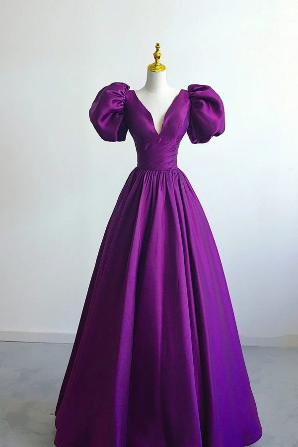 Purple Satin A Line Short Sleeves Long Formal Dress, Purple Evening Dress Prom Dress KPP1742